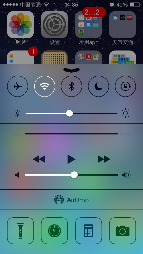 底端向上滑动可见专属ios7的新添加的后台。可添加APP快捷方式(如相机、计算器、电筒等),还有模式选择(如飞行模式、wifi,蓝牙等)。方便快捷!