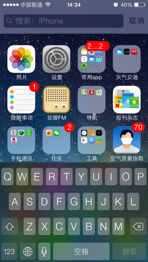 ios6向左滑到最尽头就是搜索项,但在ios7里面,搜索项隐藏了。在屏幕随意点击向下滑,就能出现搜索项。