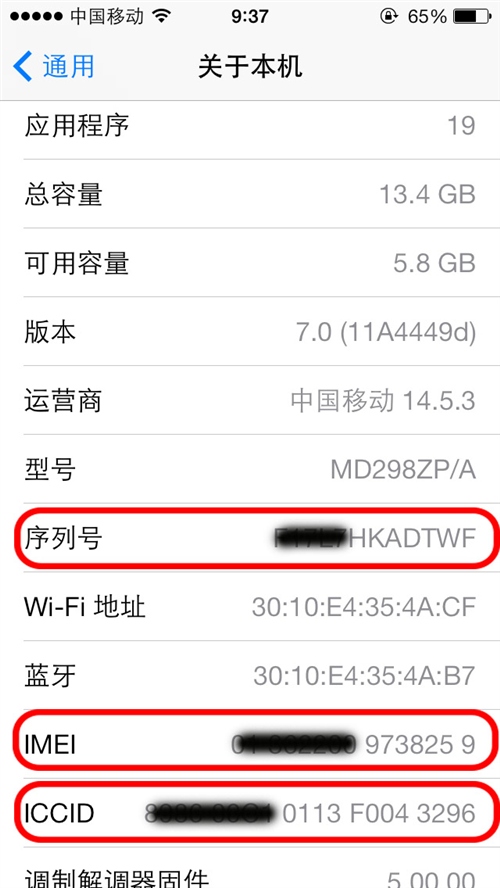 新购买的iPhone,请进入手机桌面上的“设置”-“通用”-“关于本机”,对手机的各种产品码截图保存,如下图:
