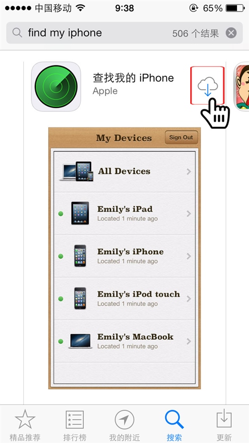 去苹果应用商店Appstore下载“查找我的iPhone(Find My iPhone)”,立刻安上,用你的APPLE ID登陆上去。就可以看到你现在的位置(也就是你手机所在的位置)如下图: