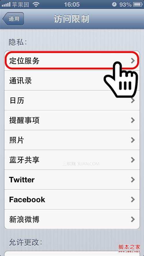 第7步:设置密码成功后,“访问限制”将可以使用,此时主列表中的程序项目均可以修改。向下滑动列表,找到隐私选项中的“定位服务”;