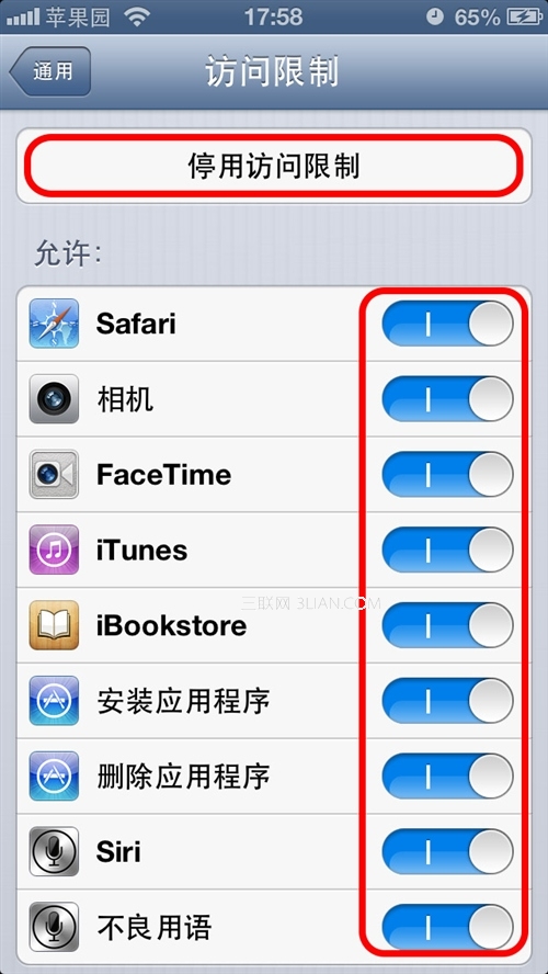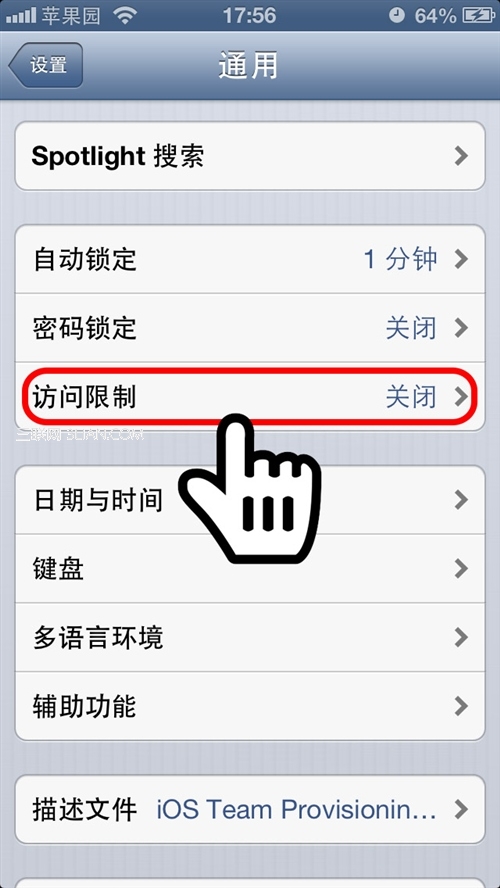 第3步:在“通用”设置中,找到“访问限制”。默认状态下,该项目为关闭状态,接下来我们要把该选项打开,点击进入;