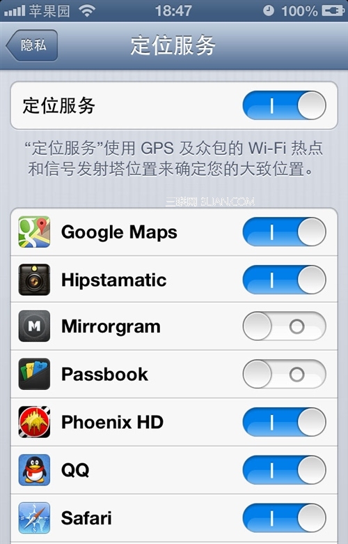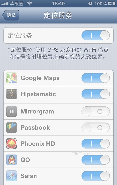 第4步:在定位服务中,位于最上面的是定位服务的总形状,点击右侧的滑块可以把整个定位服务关闭。在下方是当前手机中涉及定位服务的应用列表,蓝色表示该应用定位服务已经打开,点击开关可进行单一程序的关闭或打开;