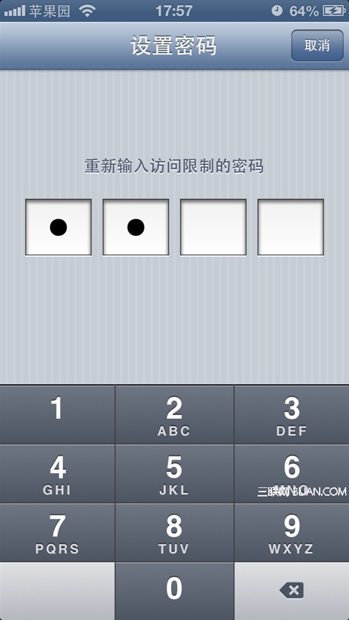 第5步:由于“访问限制”权限很大,将影响到很多重要的设置,所以为了安全起见苹果强制要为其设置四位密码。按小键盘可输入密码,为防止旁边有人偷窥,密码在手机上将统一以点显示;