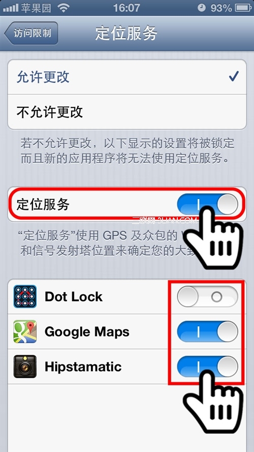 第8步:进入定位服务详细设置。注意对比一下与方法一中的区别。除了下方的的总开关和应用程序分项开关外,在最上面还多了一个锁定选项,用户可以选择 “允许更改”或“不允许更改”。当选择不允许更改时,即进入加密状态。无论是对总开关或应用程序的分项开关的设置,都将被锁定,普通用户通过方法一用修改隐私选项的方法将不能修改定位服务。