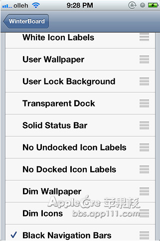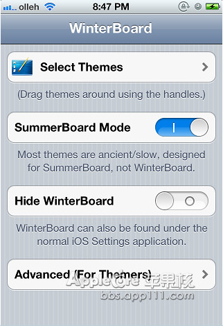 上传完毕后,进入winterboard中的theme,并且勾选主题。
