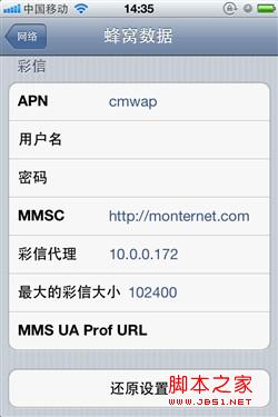 在“蜂窝数据”中填写如下数据。APN:cmnet;用户名:空;密码:空;在“彩信”中填写如下数据。APN:cmwap;用户名:空;密码:空;MMSC:http://monternet.com;彩信代理:10.0.0.172.最大彩信大小:102400;MMS UA Prof URL:空;