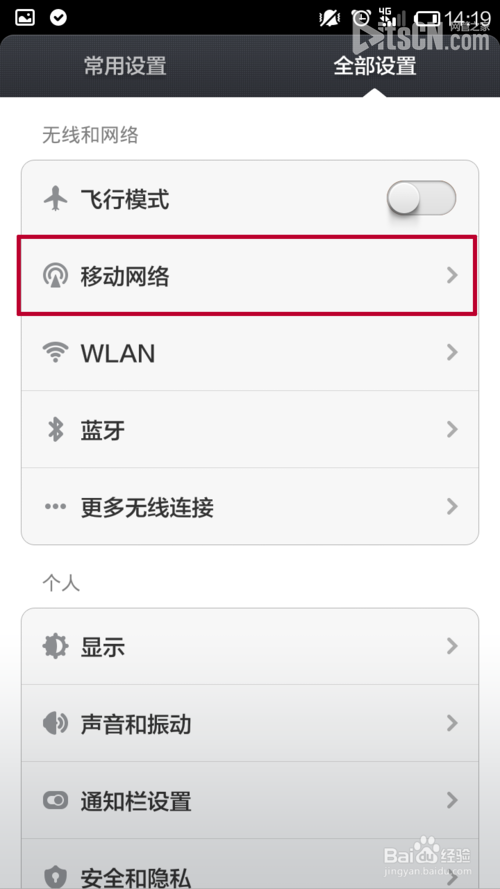 3、进入设置页面之后,我们点击上边全部设置,在找到移动网络的字样进入。