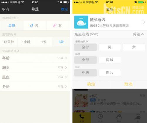 相比之下比邻并没有非常具体的LBS服务,在“发现”界面只能看到其他用户所处的城市和上线时间。点击右上角的筛选,你能筛选其他用户的性别,是全国用户还是同城用户。