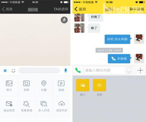 陌陌和比邻的聊天界面对比(左为陌陌右为比邻,以下雷同)