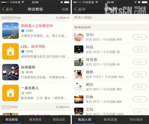 陌陌在群组功能方面也颇费心思,除了类似于QQ群的“陌陌群组”,也有类似于百度贴吧的能发帖回帖的陌陌吧,打开“留言板”则可以看到附近用户的动态。比邻则有一个类似QQ空间的“好友动态”功能,可以让你查看和评论好友的最新吐槽。