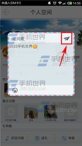 3)点击【扔定向瓶】的按钮,输入瓶子内容后点击【纸飞机】即可扔给TA啦。(如下图)