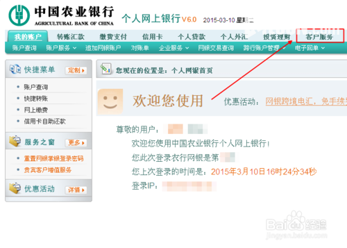 4、成功登录农行网银后,先在导航栏点击【 客户服务 】