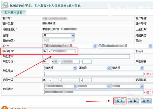 6、在基本信息页这里找到【 移动电话 】一栏。这里显示的就是您预留在农行的原手机号。