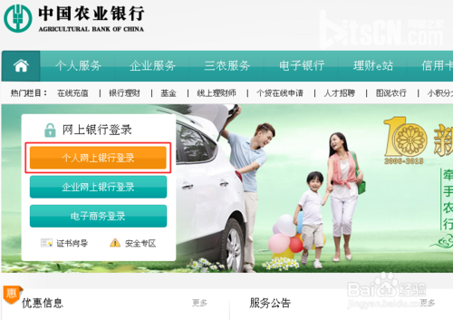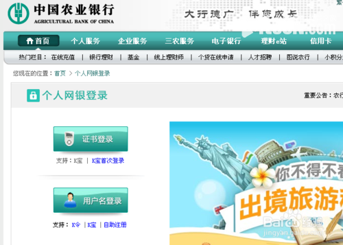 2、首先将您的K宝、或K令插入电脑。然后打开农行网银首页点击【 个人网上银行登录 】