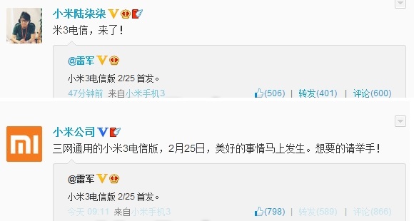 小米CEO雷军今天在微博上推文称“小米3电信版将于2月25日正式发布上市,电信版小米3依旧给我们带来了惊喜,电信版小米3将支持中国联通/移动/电信三大网络运营商的3G网络,是一款类似于努比亚Z5s/Z5s mini的三网通吃手机,米粉用户再也不用担心,网络支持问题了”。