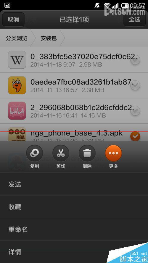 3、打开安装包的选项,然后选择一项需要传送的文件,常按此文件即可选中,也可以多选。
