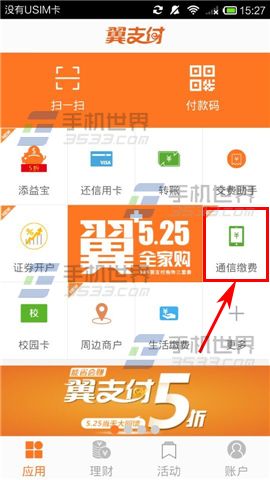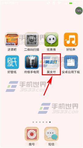 1)打开【翼支付】,进入到应用首页,点击【通信缴费】按钮。(如下图)