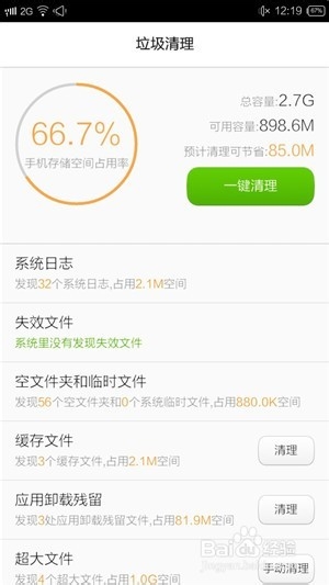 在安全精灵或者360手机卫士等等,手机安全软件可以批量处理大文件、缓存文件、系统日志空文件夹和临时文件、应用卸载残留、应用安装包等等这些垃圾文件,根据需要处理!一般不用各种卫士,习惯的云粉可以自测。
