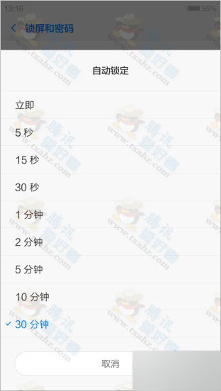 2)设置 - 锁屏和密码 - 自动锁定,时间设置尽量长点,比如小编设置30分钟。如下图: