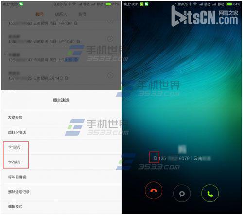 3)通过上面的设置了【卡2】为默认拨号的话,点击号码会直接使用卡2拨号。如果要使用【卡1】通话我们只需长按该号码选择【卡1拨打】即可。(如下图)