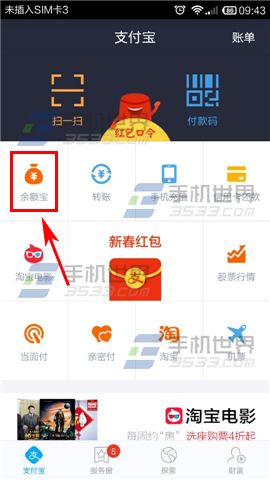 1)打开【手机支付宝】,进入首页后点击进入【余额宝】专区。(如下图)