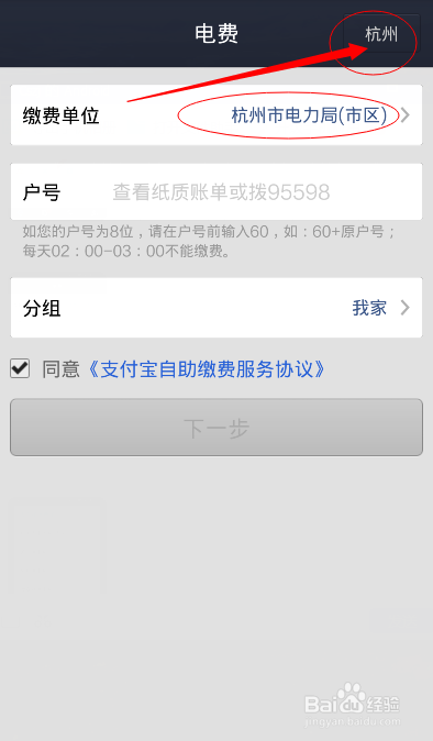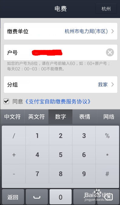 4、接下来是输入户号,每个家庭有唯一的户号,注意此户号是专门用来交电费的户号。