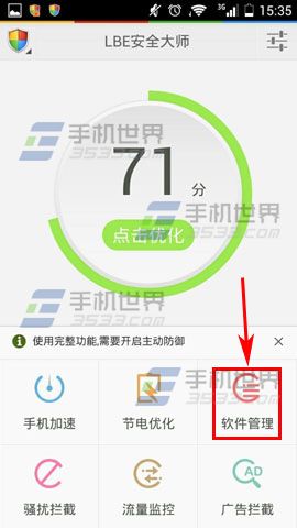 1)首先先打开【LBE安全大师】,接着进去后点击【软件管理】。(如下图)
