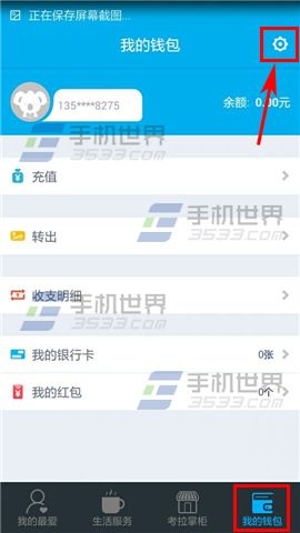 1)打开拉卡拉,点击【我的钱包】栏右上角的【齿轮标志】;(如下图)