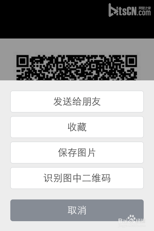 3、长按屏幕中的二维码,出现如下对话框,点击“识别图中二维码”,搞定!