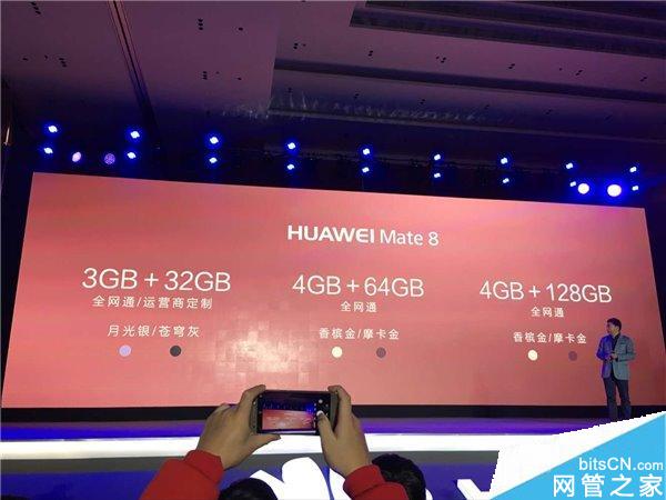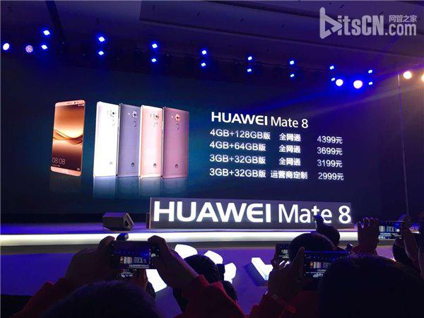 Mate8售价2999元起。3GB+32GB 运营商定制版2999元;3GB+32GB 全网通3199元;4GB+64GB 全网通3699元;4GB+128GB 全网通 4399元。
