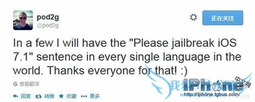 随着Winocm和iH8Sn0w相继放出iPhone4和iPhone4s成功实现iOS7.1完美越狱视频,之前一直坚称不会专门为iOS7.1推出完美越狱工具的iOS7越狱梦之队主要成员pod2g,近日,在推特与网友互动之时却暗示iOS7.1完美越狱工具将很快放出。