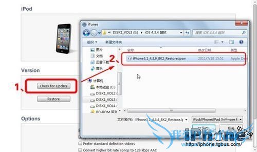 可以使用 iTunes 线上升级到 4.3.5 版本,也可以先将 iOS 4.3.5固件(点击下载)下载到本地,然后打开iTunes"按住键盘shift+鼠标点恢复按钮” 读取本地的 iOS 4.3.5固件。本人建议使用后者,因为 iTunes 下载固件速度太慢。如果机器已经是iOS 4.3.5 则可略过此步。