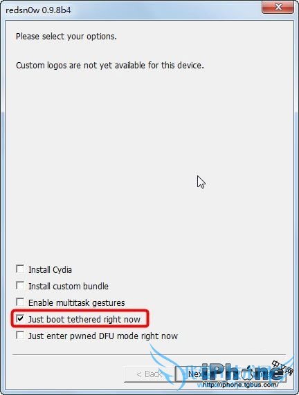 由于目前仍不能完美越狱(即关机重启后需要再次使用红雪 RedSnow rc0.9.8b4 引导进入越狱模式),所以我们还需要重复以上步骤,不过在越狱选项时,我们选择“Just boot tethered right now”。