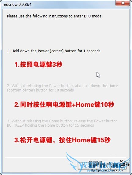进行上述步骤后,红雪将会提示您将设备链接上电脑,之后关闭电源,准备进入 DFU 模式。如果第一次进入 DFU 模式失败的话,多试几次即可。