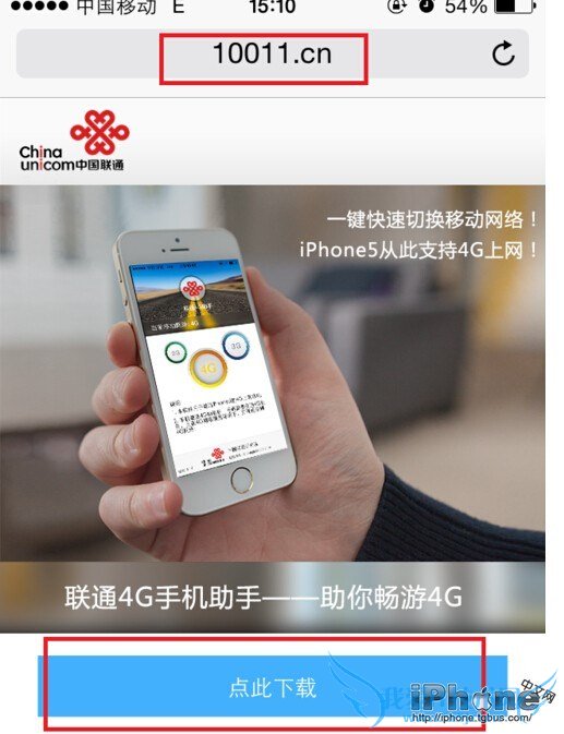 第二步:如何安装软件,只需有iphone的浏览器在浏览器里面输出10011.cn即可,点击“点此下载”按钮后,该APP就会自动出现在桌面上,如下图