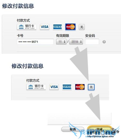 3、选择图所示的“无”,最后点击“完成”,这样就解除了信用卡的绑定: