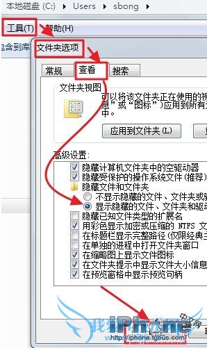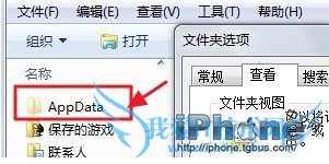 3.进入个人文件夹后,找到AppData文件夹,如果没找到这个文件夹,那么可能是被系统隐藏了,点击当前文件夹上方的【工具】按钮,选择【文件夹选项】-点击【查看】向下拉滑动条,找到隐藏文件选项,选择【显示】-点击【确定】就找到了AppData文件夹