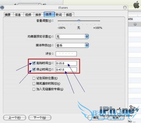 6、在选项标签栏中设定开始时间和结束时间。改时间根据你的喜好截取其中的某一段作为铃声;