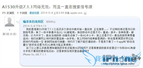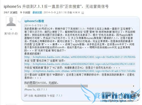 来自苹果官网论坛中,一位用户频繁的表示自己的iPhone5S手机在升级iOS7.1.1版本操作系统之后,自己手机的网络一直处于“正在搜索”状态,重启手机、开飞行模式、重新插卡、还原网络设置等等都不能改变这一问题。