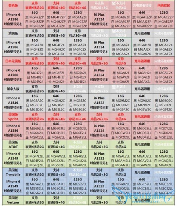 如下是iPhone6 Plus各个常见版本之间的型号、支持网络制式、容量、型号等详细对照表: