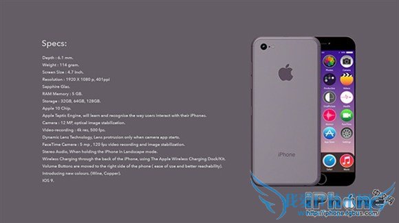 硬件参数方面,Yasser Farahi也给出了很详细的预测。iPhone7整机厚度为6.1毫米,重114克;采用4.7英寸屏幕,分辨率为1920*1080,ppi达到401,玻璃面板材质为蓝宝石;5GB运行内存,机身存储空间为32GB、64GB、128GB可选。iPhone7将会使用苹果自家的A10处理器芯片,并集成Apple Watch的Taptic Engine,智能识别用户与手机的交互意图。