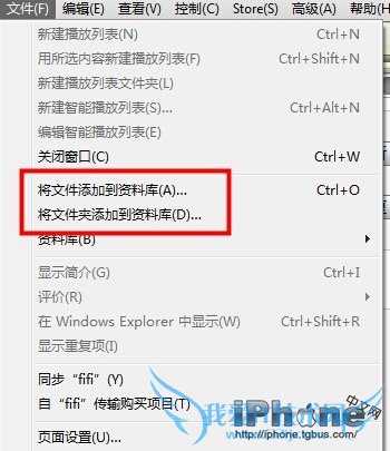 点击iTunes顶部的“文件”菜单,可以看到两个添加选项:将文件添加到资料库、将文件夹添加到资料库。添加文件可以选择文件夹中的一个或几个添加,而添加文件夹则会将整个文件夹中的所有内容全部添加,大家可以根据自己的需要来选择使用哪种方式。
