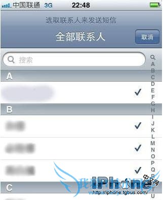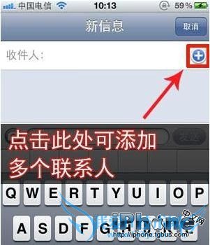 3、在”收件人”栏中,你可以直接输入字母、数字快速查找并添加联系人;如果联系人不在通讯录中,你也可以直接输入手机号码;当然,你也可以选择更加直观的操作,轻按 “+” 按钮直接转到通讯录中添加。由于目前iOS不支持批量添加,只能一个一个添加联系人,虽然这样可以使用iPhone群发短信但是有些麻烦!