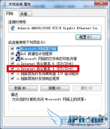 6、在弹出对话框中选择“网络”选项卡中的“Internet协议版本4(TCP/IPv4)”;