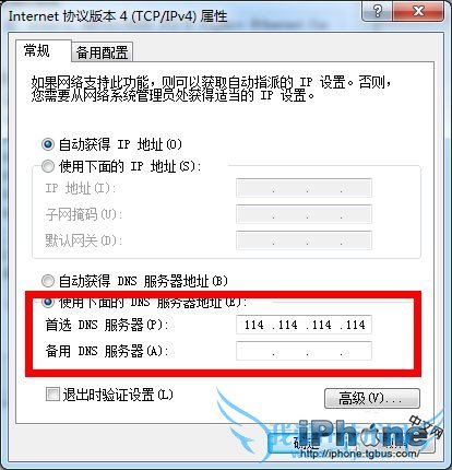 7、在属性对话框中选择“使用下面的DNS服务器地址”,在“首选DNS服务器(p)”一栏中输入“114.114.114.114”.然后选择确定即可。