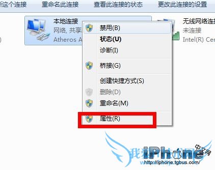 5、选中“本地连接”,右键弹出菜单,选择“属性”;