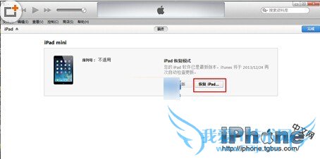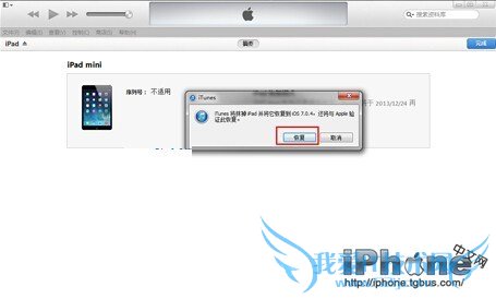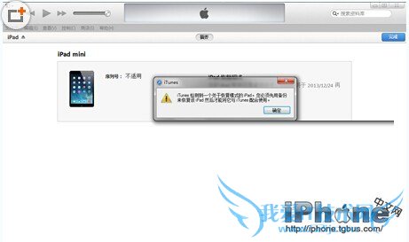 二、iTunes会自动检测到一台等待恢复的设备,点击确定:
