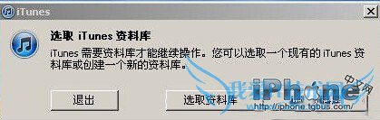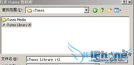 5.点击【选取资料库】,在之前移动到其它盘的itunes文件夹中找到【itunes Library.itl】(如D:\itunes\itunes Library.itl),点击【打开】