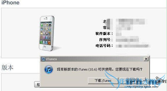 下图中【现在有新版本的itunes(10.6)可供使用。您要现在下载吗?】就是表示itunes有了更新的版本10.6版本,然后点击【下载itunes】。对itunes的更新对iPhone或者iPad是没有影响的。